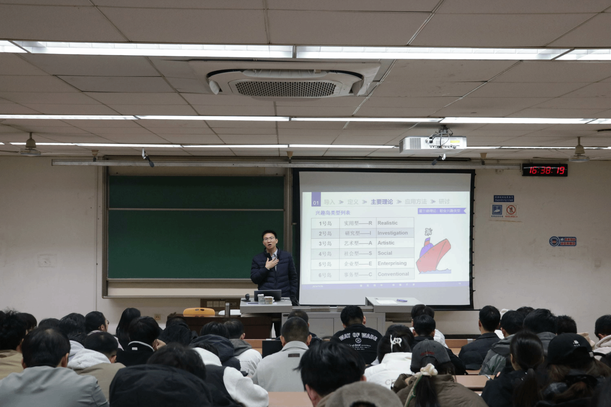 为扎实开展研究生新生入学教育,帮助2024级研究生笃定清晰的个人发展目标,树立良好的职业心态,11月26日下午,18H 在九里校区4209举办了职业生涯规划讲座。本次讲座由2024级研究生辅导员杨冰倩主持,学院团委书记、高级职业生涯规划导师、学院青年讲师团成员杨都强主讲。