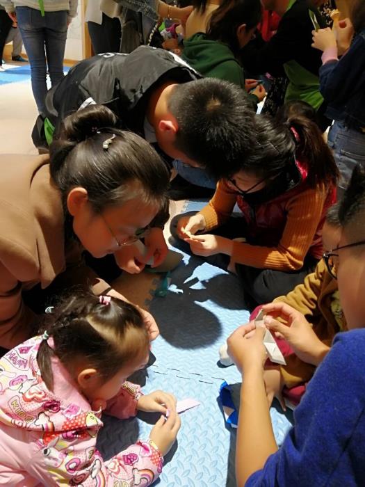 志愿者们在这次的活动中带领着孩子和家长学会了用纸折小青蛙。志愿者们年纪虽小,但热情十足,他们一遍遍认真仔细的教孩子们折青蛙,给孩子们讲小青蛙的故事,跳小青蛙的舞蹈,讲小青蛙的绕口令,生动形象的为小孩子们编织了小青蛙的梦。