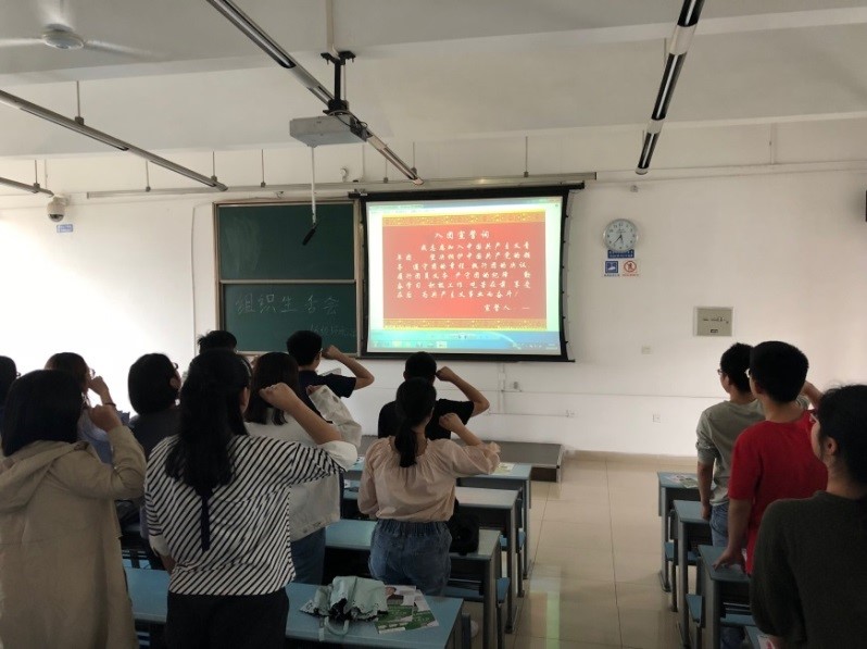 接下来进行重温《入团第一课》,并宣誓。视频感染了现场所有青年学子,让团员青年们对共青团的丰富内涵与历史积淀有了更深的了解。视频结束后,重温入团仪式正式开始。在老团员的带领下,全体团员青年起立,高举右手进行入团宣誓,铮铮誓词在室内回荡,每位团员胸佩团徽,表情庄严肃穆,誓词铿锵有力!入团仪式历历在目,重温入团仪式流露出的是全体共青团员不忘初心,继续前进的坚定决心。