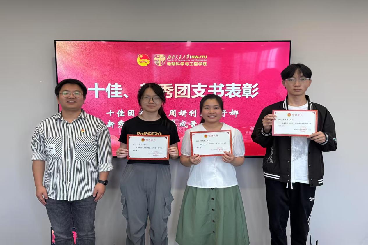 会议尾声,学院团委对表现突出的团支书进行表彰,周妍利、冯子娜获评“十佳团支书”,廖成晋荣获“新秀团支书”称号。文强老师为获奖者颁发证书,并鼓励他们继续努力,发挥榜样作用,希望全体团支书以三位同学为榜样,让团的工作走入同学心中,落入行动。