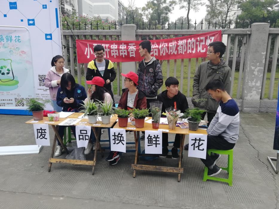 青年志愿者协会承办的“废品换鲜花”活动在二、四食堂门口展开了活动。