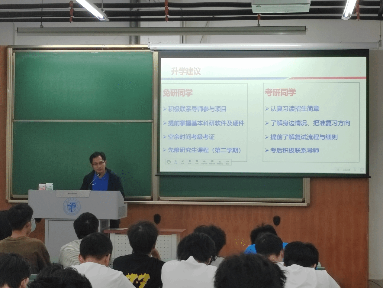 交流会现场,廖昕老师首先围绕学科介绍、专业建设、师资概况、研究方向等向同学们介绍了地质系概况,同时介绍了创新型人才国际合作培养项目,解答了专硕和学硕的区别,解读了学院研究生招生简章。