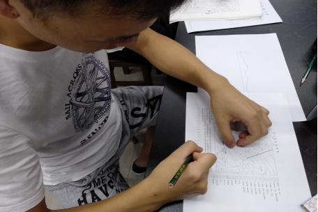 参赛选手积极讨论比赛方案,认真绘图。