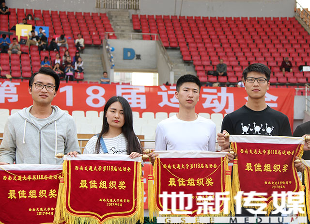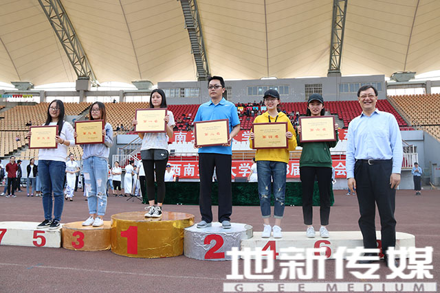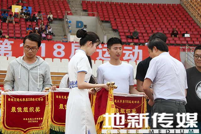 之后由体育部刘江主任宣布“最佳组织奖”获奖单位,并由体育部副主任高平为“最佳组织奖”获奖单位颁奖。地球科学与环境工程学院、土木工程学院以及峨眉校区等众多学院都获得了运动会“最佳组织奖”。