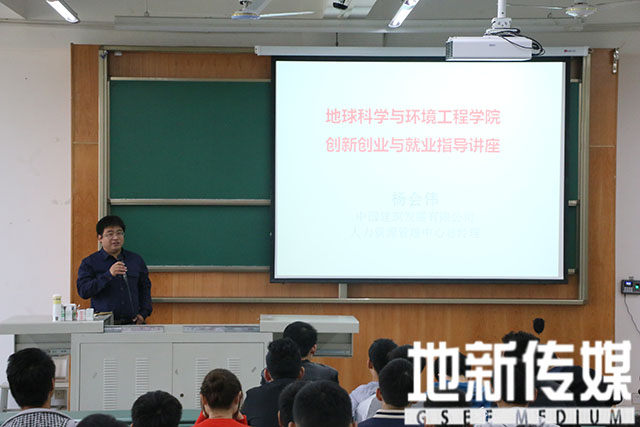 在X4359教室举办地球科学与环境工程学院创新创业与就业指导讲座,讲座由中国建筑发展有限公司人力资源管理中心总经理杨会伟主讲,由18H