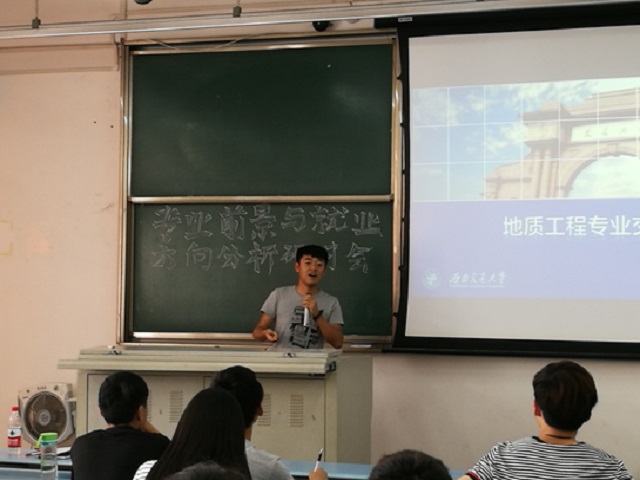 首先是测绘2013级的研究生学姐屈亚,她开门见山地指出了测绘专业本科就业的传统形式,并针对当前形势提出了自己的见解。建议同学们在校期间,应利用好现有的平台与资源充实完善自己,多参加各级竞赛、丰富自己的工作实习经验,早点做好就业准备。随后是来自消防专业的王建宇学长,他将消防专业的应用、前景、毕业去向以及学习规划进行了详尽的介绍,另外王学长还特别引用11级至15级研究生就业率高达100%的数据,告诉同学们要对未来充满信心。最后是来自我校十大国家特色专业之一的地质工程的杨恬学长。杨恬学长指出,地质工程专业就业面广,本科生的就业主要面向铁路局、工程局、地质队和设计院;研究生主要就业于各类设计院,工作环境相对较好,女生也可以在事业单位,高校,房地产等环境工作。杨学长在学习方面的建议是注重基础学科、把握机会参加全国地质技能大赛,校“地质标本鉴定”大赛等比赛,增长见识,为以后的工作做好准备。