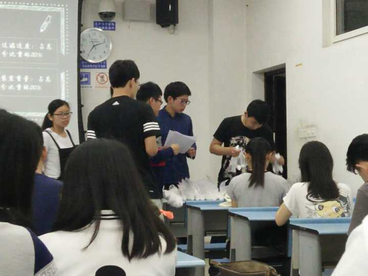 5月20日下午2:15工作人员拿检测装置所需要的电子秤、秒表以及浊度仪来到X2529,进行分工,一个人记录成绩并提醒前来参赛的选手登记,一个人记录时间,两个人操作浊度仪,其余人员负责洗刷检测所需要的装置。2:30陆陆续续有选手前来参赛,工作人员引导他们登记,比赛依照参赛选手登记的顺序进行,期间,有的选手的装置制作很成功,无论是过滤速度方面还是过滤后液体的浊度方面都近乎完美,其他选手纷纷围观,讨教经验,也有某些选手的装置稍有不足,检测完后他们互相分享经验与心得,现场气氛十分融洽。18:30比赛检测装置阶段正式结束,工作人员疏导参赛选手离开后,根据先前制定的评分细则计算所有参赛选手的总成绩,前来比赛的队伍达25组,根据成绩的高低从中得出获奖的6组同学。