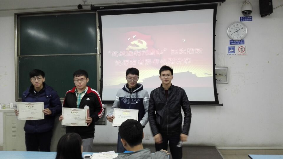 本科2014级党支部在X2323教室开展抗战胜利70周年征文活动优秀个人表彰会,支部组织员刘冠军老师,支部全体成员及入党积极分子参加了本次表彰会。党支部书记杨都强老师主持会议。