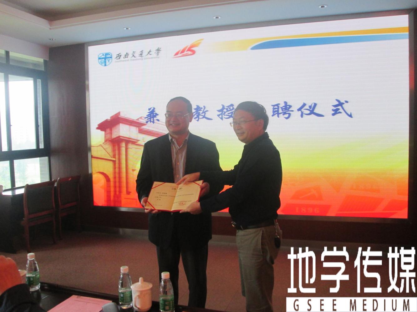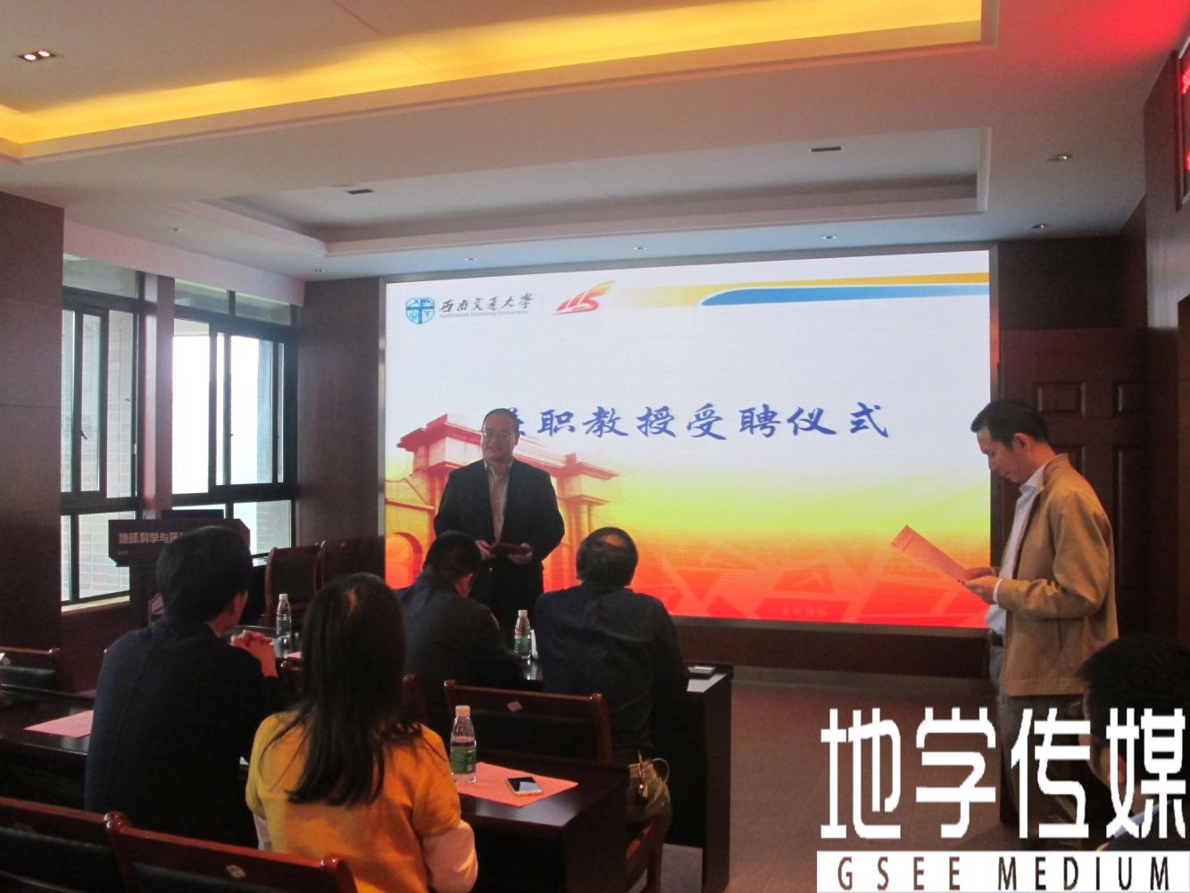 的感谢之情,并与各位领导合影留念。在场嘉宾给予了热烈掌声。受聘仪式结束后,施毅主任发表了重要讲话。他肯定了周健鹏教授在业内取得的不菲的成就,并代表学院表达了对周教授受聘为我院兼职教授的喜悦之情,最后希望周教授通过自己的学识,见识和业内良好的人际关系为我院环境学科的发展与繁荣再添一股强大的助力。