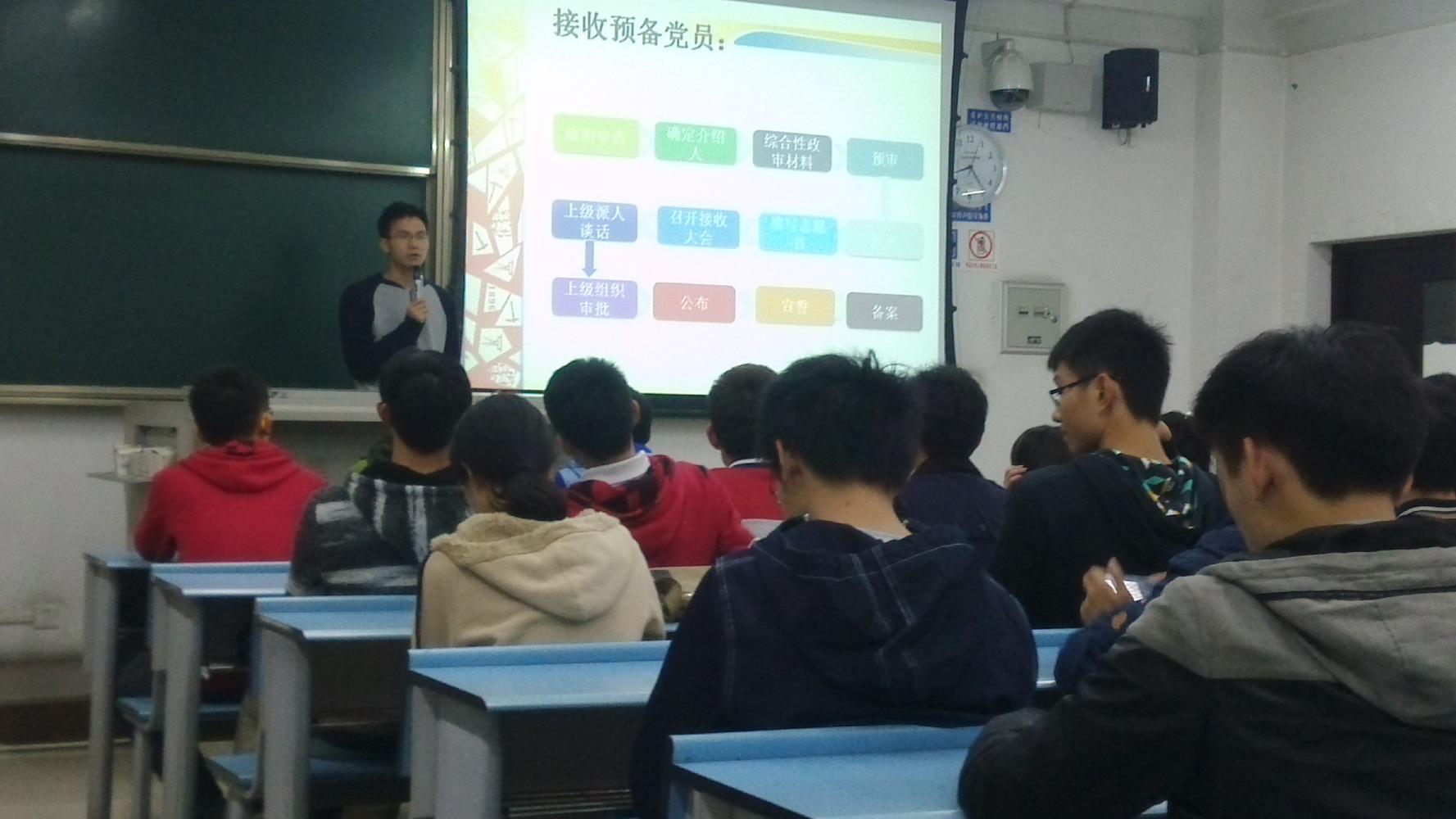 杨都强老师就党性的培养、党对党员的要求等方面谈了自己的见解,并希望在座的各位党员、预备党员、入党积极分子能够树立正确的入党动机,通过多学习党史,了解我党从严治党的方针政策,并且在生活学习中严格要求自己,积极主动的做好模范带头作用,做到“一边学习,一边感悟,培养党性”。杨都强老师的一席话赢得了同学们的热烈掌声。副书记王绪国从什么人可以入党、怎么入党、为什么要入党三个方面给大家详细介绍了入党流程,传达了学校、学院学生党建工作的要求,并就档案资料规范填写等工作做出了严格具体的要求。同时,王绪国强调到,各位入党积极分子务必进一步提高入党积极性,更加端正入党动机,积极主动的对待党组织安排的各项任务,争取早日入党。胡鑫同志结合学校、学院的相关工作安排和支部自身的发展,给大家介绍了近期支部党日活动的安排,就活动内容、活动形式展开讨论,并对各位积极分子提出了参与党日活动相关的要求。