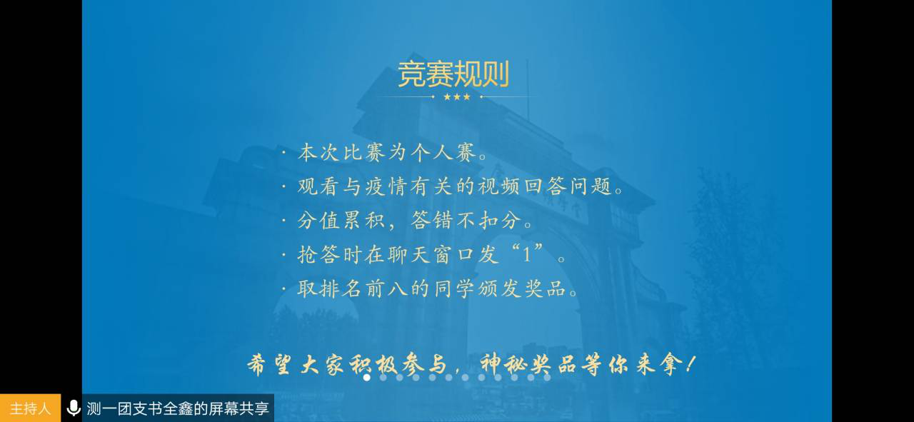 活动进行期间,大家认真观看视频、学习相关知识并积极参与答题,在欢乐而紧张的气氛中完成了线上知识竞赛活动。活动最后,几位同学主动分享了自己在疫情期间的思考与感悟,引起大家共鸣。