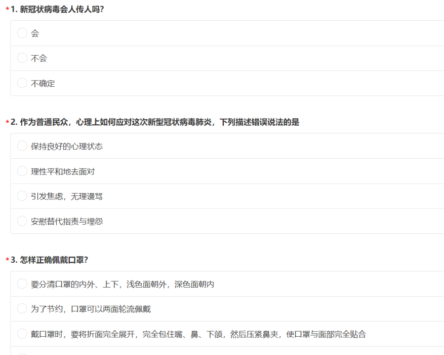 本次知识竞赛围绕疫情基本知识来设题,共20题,100分。最后奖项获得者按照“分数>时间”的方式来评测出前六名。每人仅做一次,重复答题不记录成绩。
