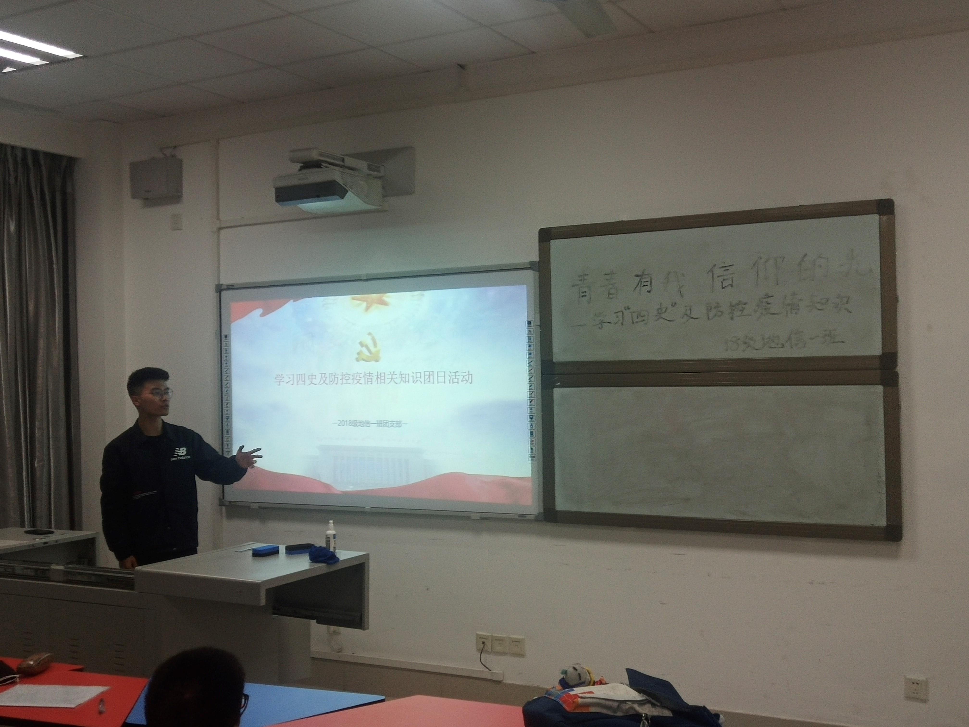 2018级地信一班于10月11日在x4133教室开展“学‘四史’,守初心,肩使命”主题教育活动,通过资料阅读和知识问答等形式深入学习贯彻落实习近平总书记关于党史、新中国史、改革开放史、社会主义发展史,及新冠肺炎疫情防控工作的重要讲话和指示精神,持续深化新时代爱国主义教育。本次教育活动由地信一班团支书苏刘鹏主持,由地信一班班长曹正阳主讲,地信一班全体同学参加。