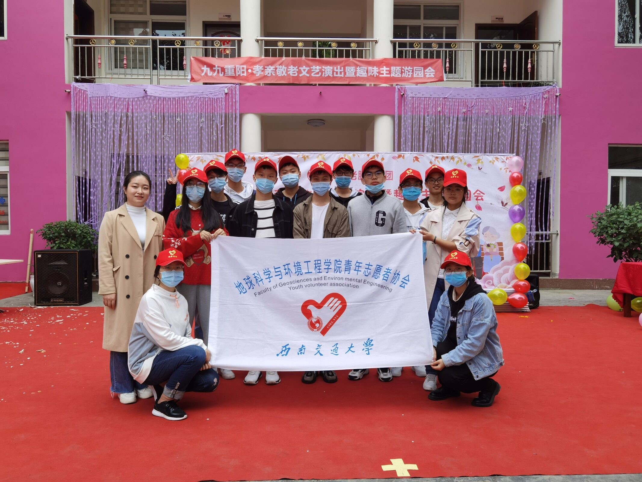 东校门,经过二十分钟的骑行,来自西南交大地学青协的志愿者共13人抵达了位于方安路的颐园敬老院。进行进门前的登记消毒后,志愿者马上投入了搀扶老人、安排座位、帮助布置现场的工作。敬老院的老人们难得迎来了这么热闹的时刻,在老人们欣喜又期待的目光注视下,志愿者们也不由得干劲满满。