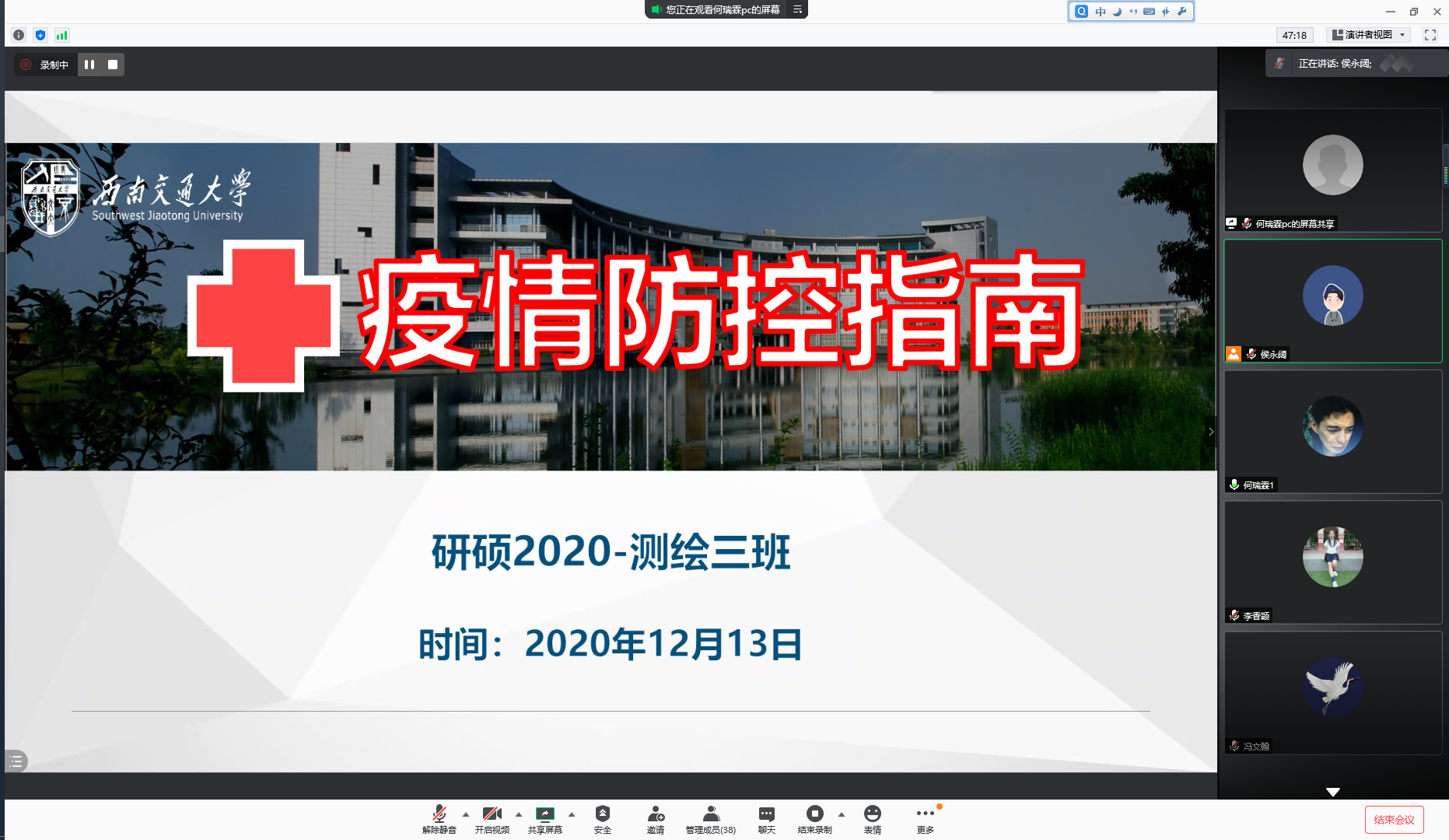 在国际视野培养与健康安全养成方面,研20级测绘三班积极开展对外交流和主题教育活动5次,先后邀请香港理工大学土地测量与地理信息学系博士生朱潇圣、德国亚琛工业大学城乡规划专业硕士生冯文翰进行生活环境、科研学习、申请博士、留学邀请等内容板块进行分享,拓展培养国际化视野。伴随着郫都区新冠肺炎疫情病例的出现,班级内多次召开卫生安全主题教育活动,号召同学们加强安全观念与自我保护意识,平安健康度过研究生生活。