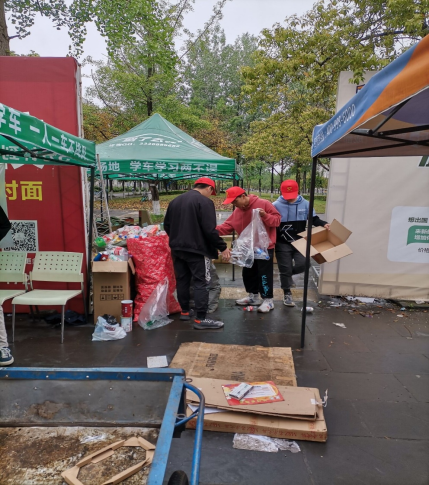 下午4:30左右,志愿者开始对活动场地内的废品进行整理,待收废品的师傅就位后便有条不紊地将废品运送上车。在此之后,志愿者们又对场地上散乱零碎的垃圾进行清理,以及对桌椅、鲜花等进行整理,为期两天的废品换鲜花活动圆满结束!