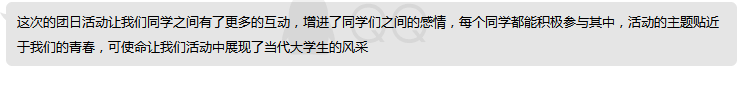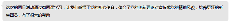 通过讲解人精彩凝练的介绍,同学们都有了各自的体会和感触。班团干部们为了巩固大家的思想教育,让同学们通过打字聊天等方式发表了自己的心得体会。