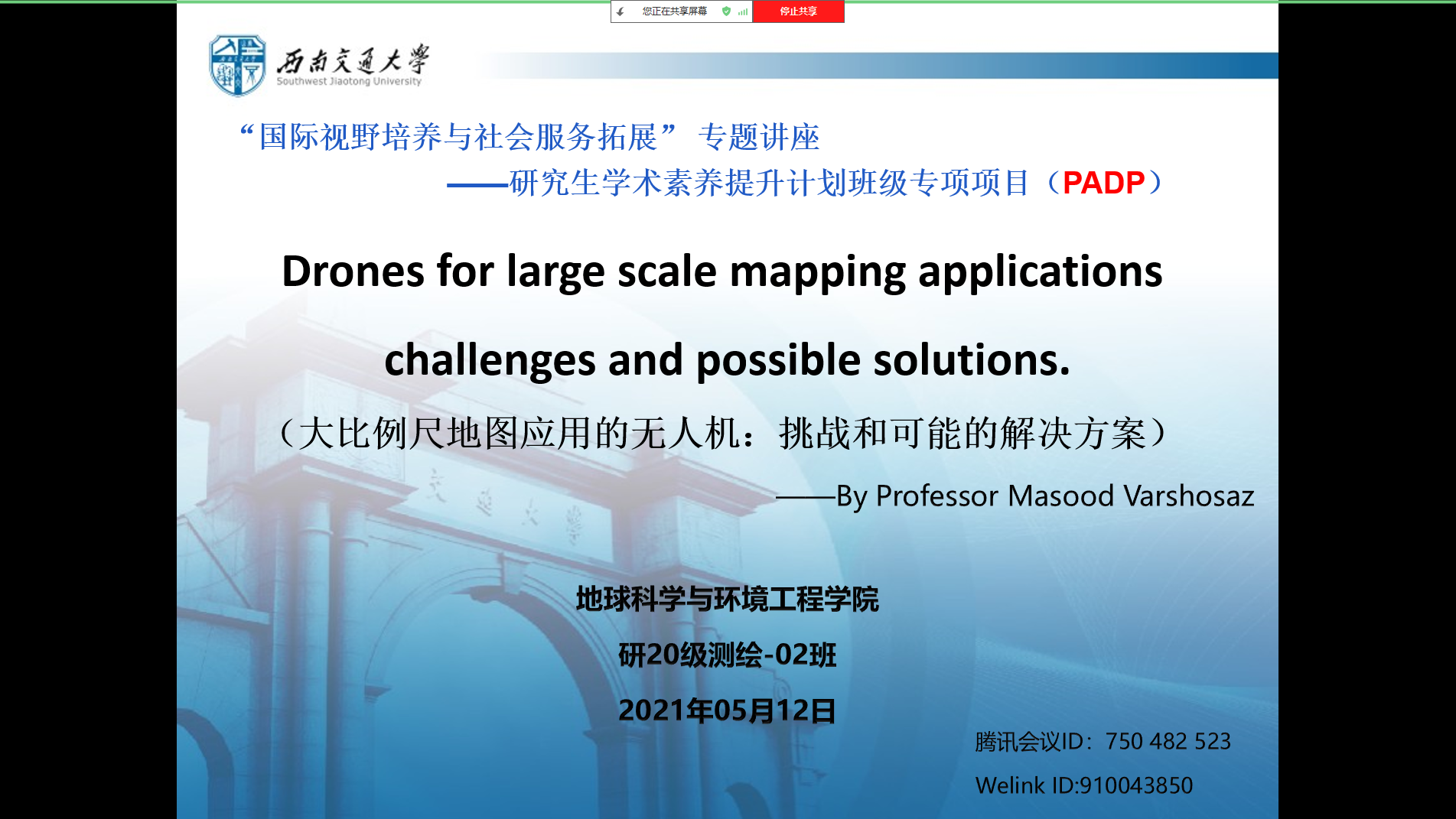为提升班级同学学术英语水平,培养国际化视野,2021年5月12日,研2020级测绘2班邀请了KN图什理工大学分享交流M.Varshosaz教授对地理信息系统前沿知识进行分享交流,并与班级同学展开交流。本次活动形式为线上开展。