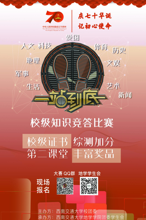 由18H 校团委主办,地学学生会承办的新生文化节—“一站到底”知识竞赛复赛将于10月26日19:30于犀浦校区X4156、X4157进行。此次比赛初赛在线上进行,共吸引了四百余名学生参加。在激烈的比拼之下,共有20名选手进入复赛。在现场你不仅可以体会到选手们之间迸发出的火花,还可以学到各个方面的知识。