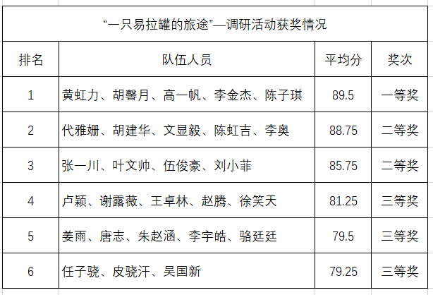 本次“绿色分类,你我共行”系列活动(一)“一只易拉罐的旅途”调研活动历经一个月的时间,参赛选手通过线上调研和线下走访,针对校园内可回收垃圾从被丢弃、回收、运输到被重新加工利用全过程各个环节以及垃圾分类现状进行追踪了解,撰写调研报告并制作宣传海报,得到同学们的积极参与。