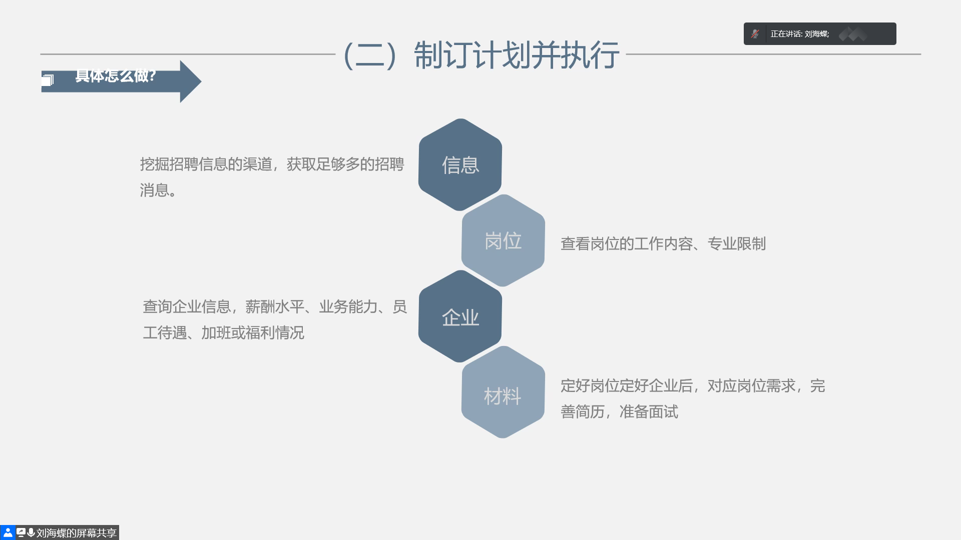 首先,刘海蝶学姐将她在求职过程中的经验分成了三个方面,分别是学会选择、做出选择和就业建议。