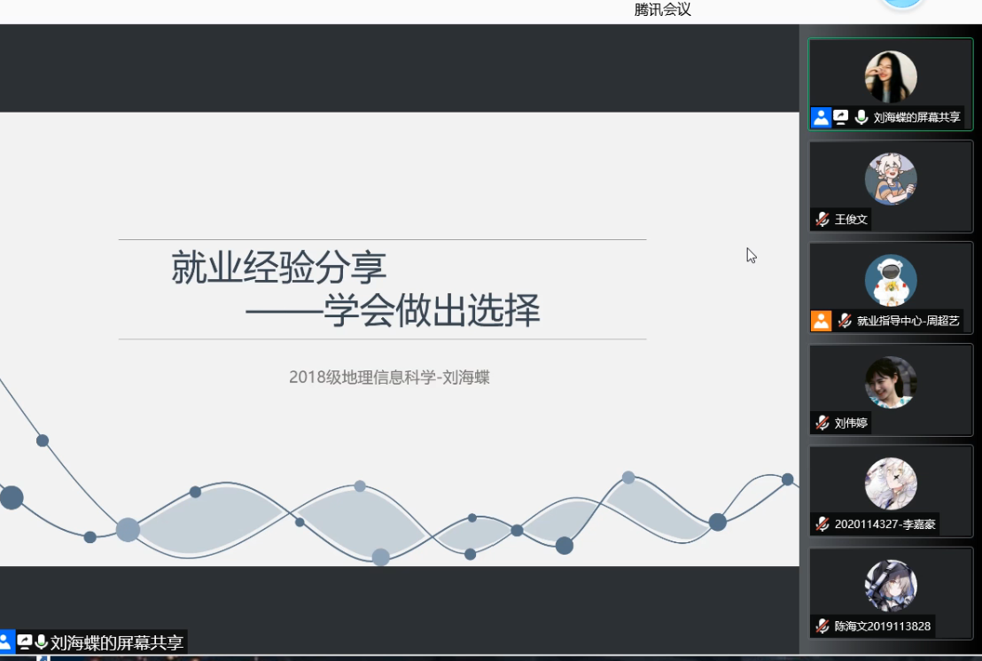 2021年10月21日晚19:30,地球科学与环境工程学院邀请学院优秀毕业生开展“生涯番茄”就业指导系列第一期讲座,本次活动通过线上平台“腾讯会议”进行,主讲人为我校2018级地理信息科学毕业生,现已签约上海华测导航技术股份有限公司的刘海蝶学姐,刘海蝶学姐作为预备党员,始终以身作则,现举办主题为“学会做出选择”的活动。
