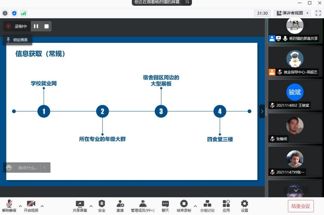 首先,杨烈镭学长谈到如何选择心仪的就业去向。学长向我们介绍了就业信息的获取方式,以及得到信息后应明确需求并分配权重,结合自身实际情况做出适当的取舍,也可通过向家人、老师、朋友等寻求帮助的方式,来帮助自己做出正确的选择。
