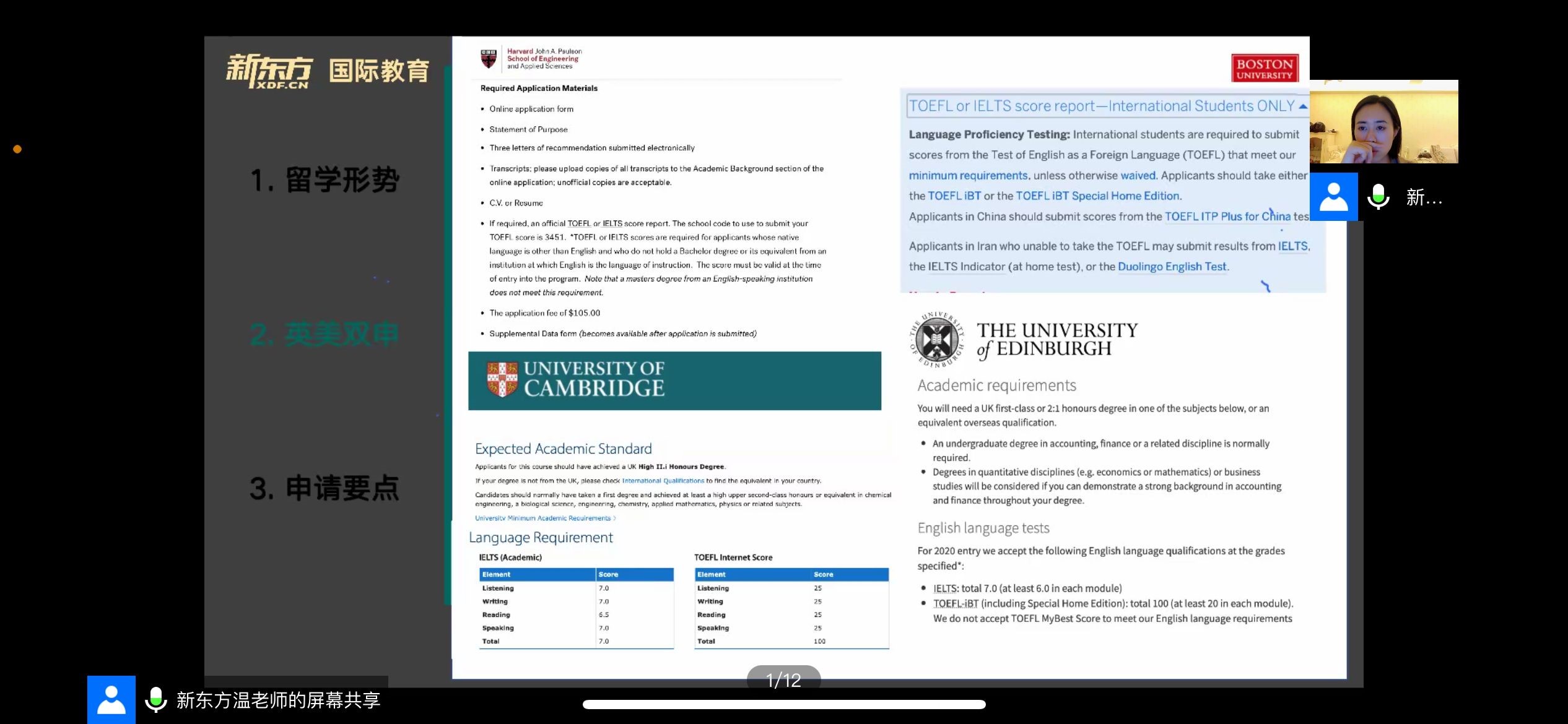 之后,温老师针对不同专业可以申请的学校以及学校的要求做了详细的解释,让有留学意向的同学更清楚的知道该准备一些什么材料,绩点以及雅思托福所需分数是多少,英美双申的流程以及注意事项,让我们对留学申请的步骤有了更清晰的认识。