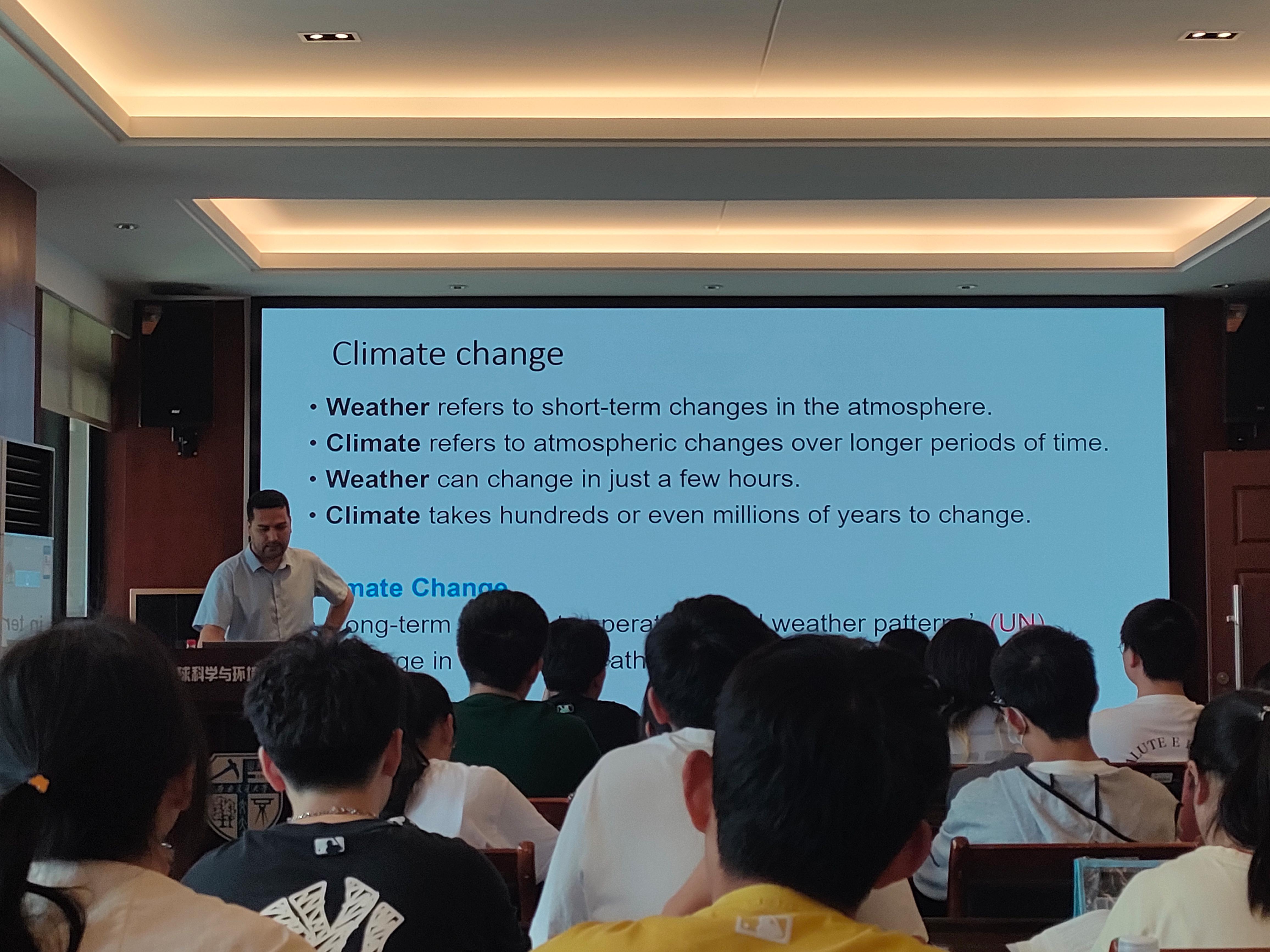 讲座伊始,Hassan副教授向大家介绍了本次讲座主题为《Environmental Challenges in China and Technological Development of Environmental Protection》,通过提问互动,吸引同学们迅速进入主题。接着,Hassan副教授针对中国Climate change问题,从专业学科角度进行分析和讲解,比如对intense droughts、water scarcity、severe fires等进行分析。