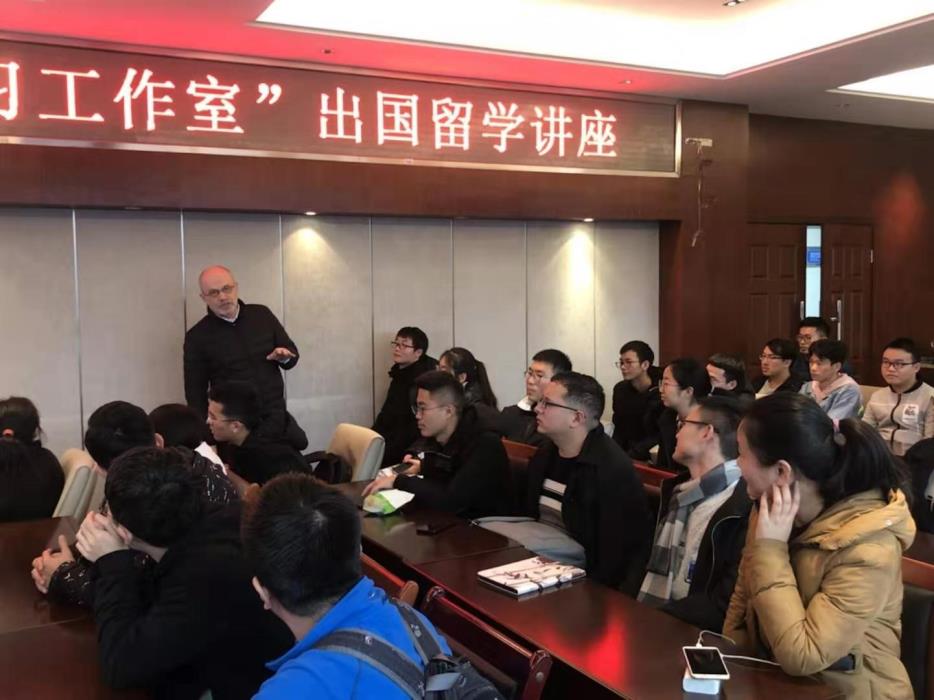 尽管最近天气寒冷,但院长还是提前到达活动地点,开始认真地准备演讲材料,参加会议的同学很多,会场座无虚席,大家饱含憧憬地等待着院长来为我们讲解德国波恩大学硕士研究生招生宣讲事宜,教室里充满了轻松和谐的气氛。