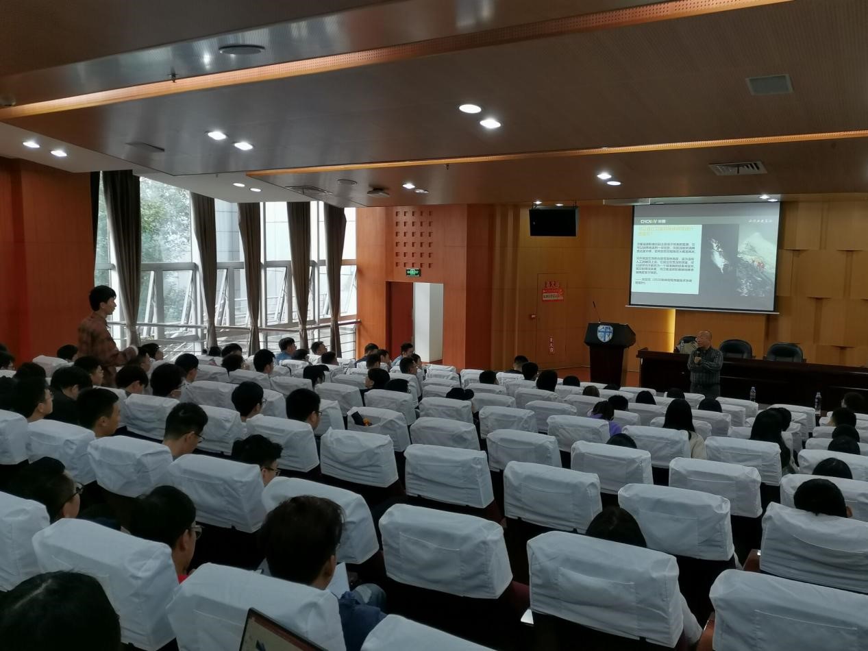 同学们在讲座报告中不时提问,胡炜副总裁就登顶珠峰及其设备的问题展开与同学们展开热烈讨论,对同学们的问题进行耐心解答。