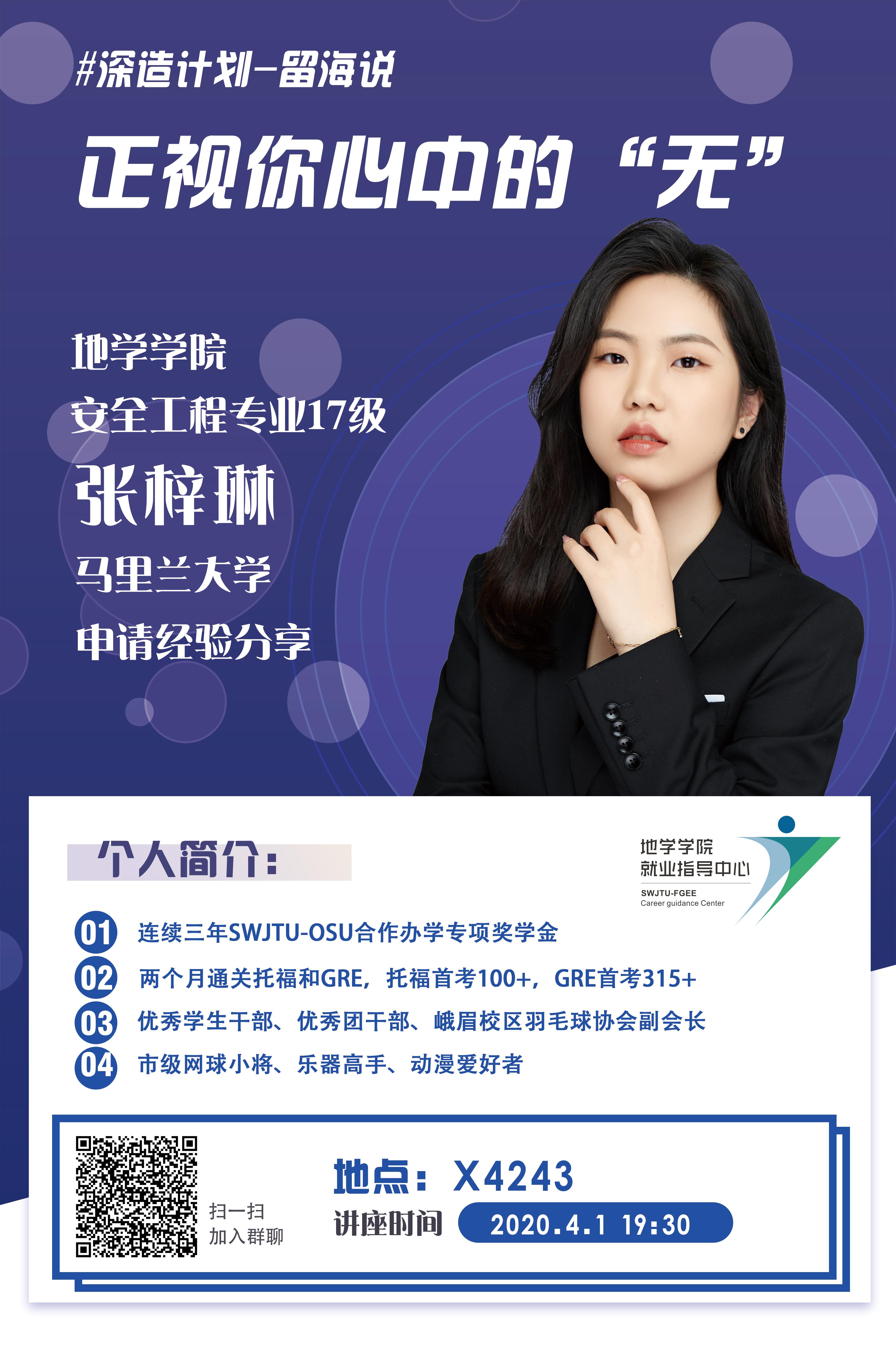 此次活动旨在为有相关留学意愿和需求的本科生与有经验的优秀学生提供一个优质的交流机会,实现学生与学生之间资源共享、更高效率的面对面探讨与交流。同时,过来人的经验,更有针对性的帮助本科生们解决疑惑,带来一些启示和帮助,使学生们更了解留学的相关知识,提高学生国际视野,明确未来的深造规划。第二期讲座已完满结束,现将第三期讲座信息发布如下,欢迎各位同学积极参加!