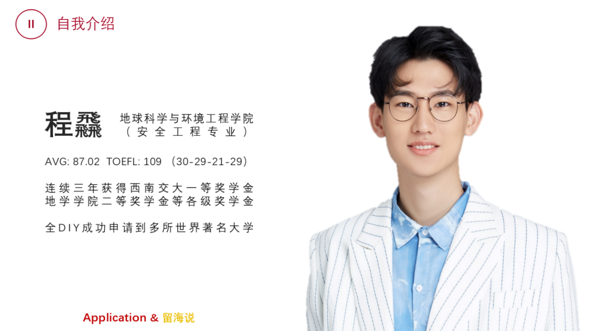 安全工程类专业大四在读优秀学长程飞主讲,主题为“英国硕博留学申请指‘北’”。