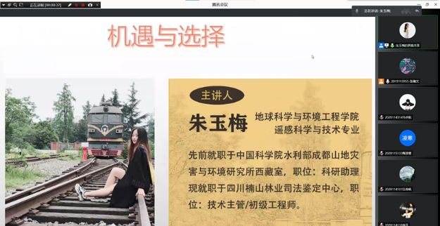 2021年6月5日晚19:30,地球科学与环境工程学院邀请学院优秀毕业生朱玉梅开展“生涯番茄”就业指导系列第二期讲座,本次活动通过线上平台“腾讯会议”进行,主讲人为我校2016级遥感类毕业生,曾就职于中国科学院水利部成都山地灾害与环境研究所西藏室的学姐。活动主题为“机遇与选择”。