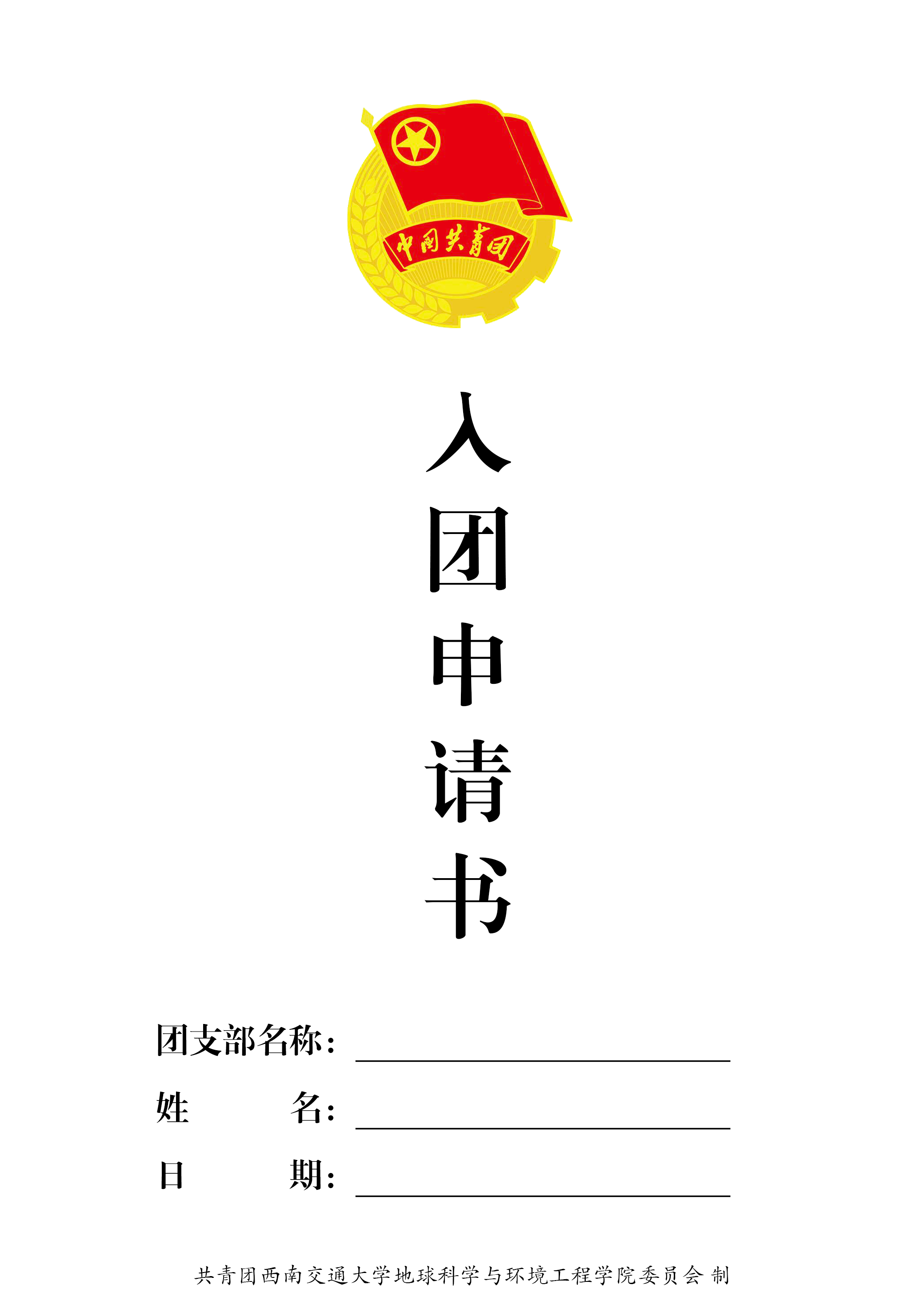 为规范我院入团流程,标准化我院新团员团员材料,请有入团想法的同学按此封面格式完成自己的入团申请书。