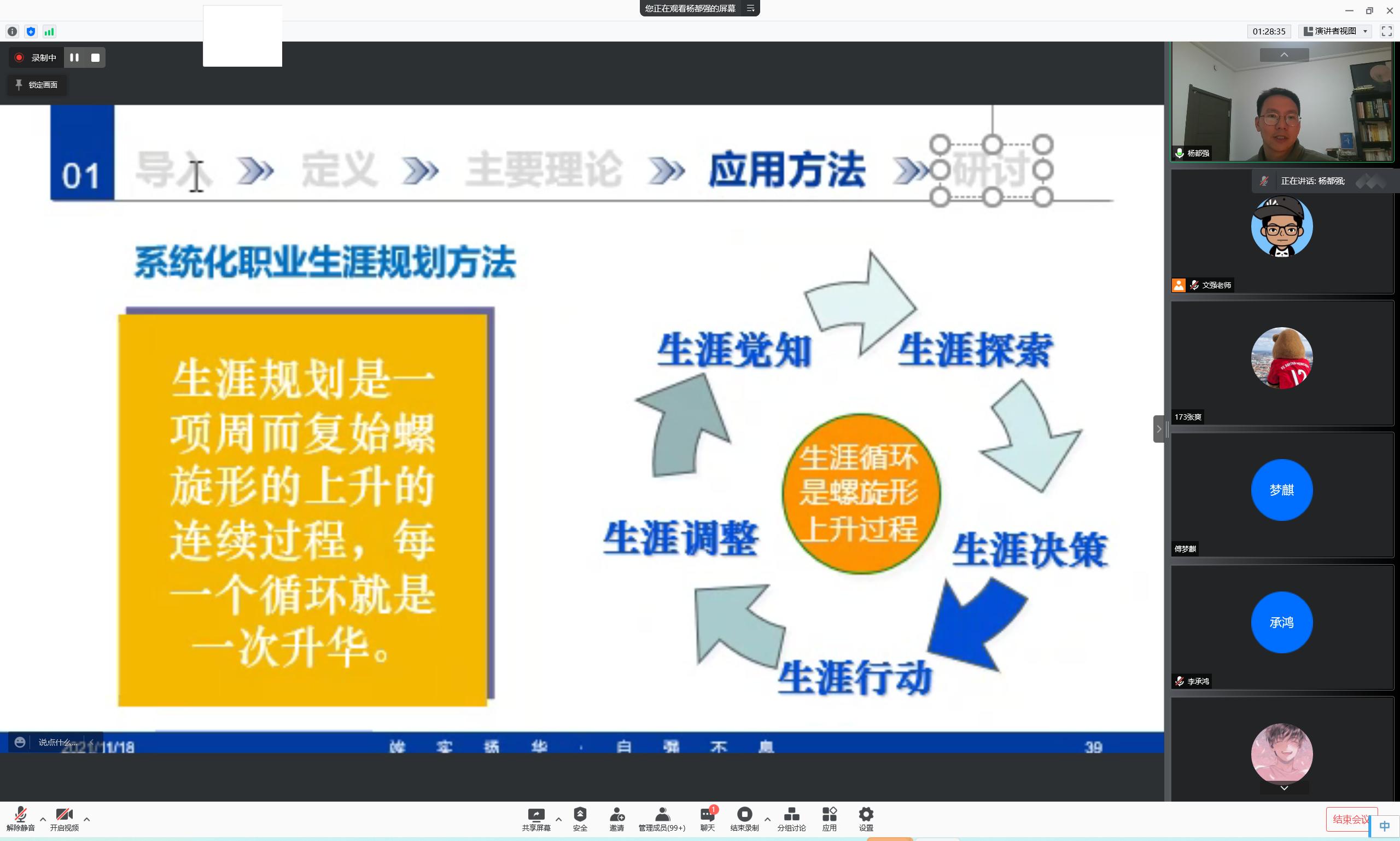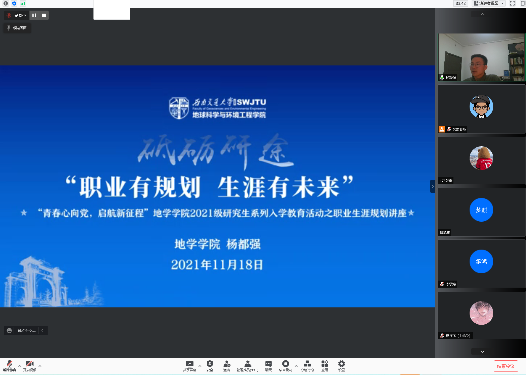 通过腾讯会议开展2021级研究生“职业有规划,生涯有未来” 职业生涯规划专题教育。本次讲座由2021级研究生辅导员文强主持,学院团委书记、中级职业生涯规划导师杨都强主讲,2021级全体新生研究生参加。
