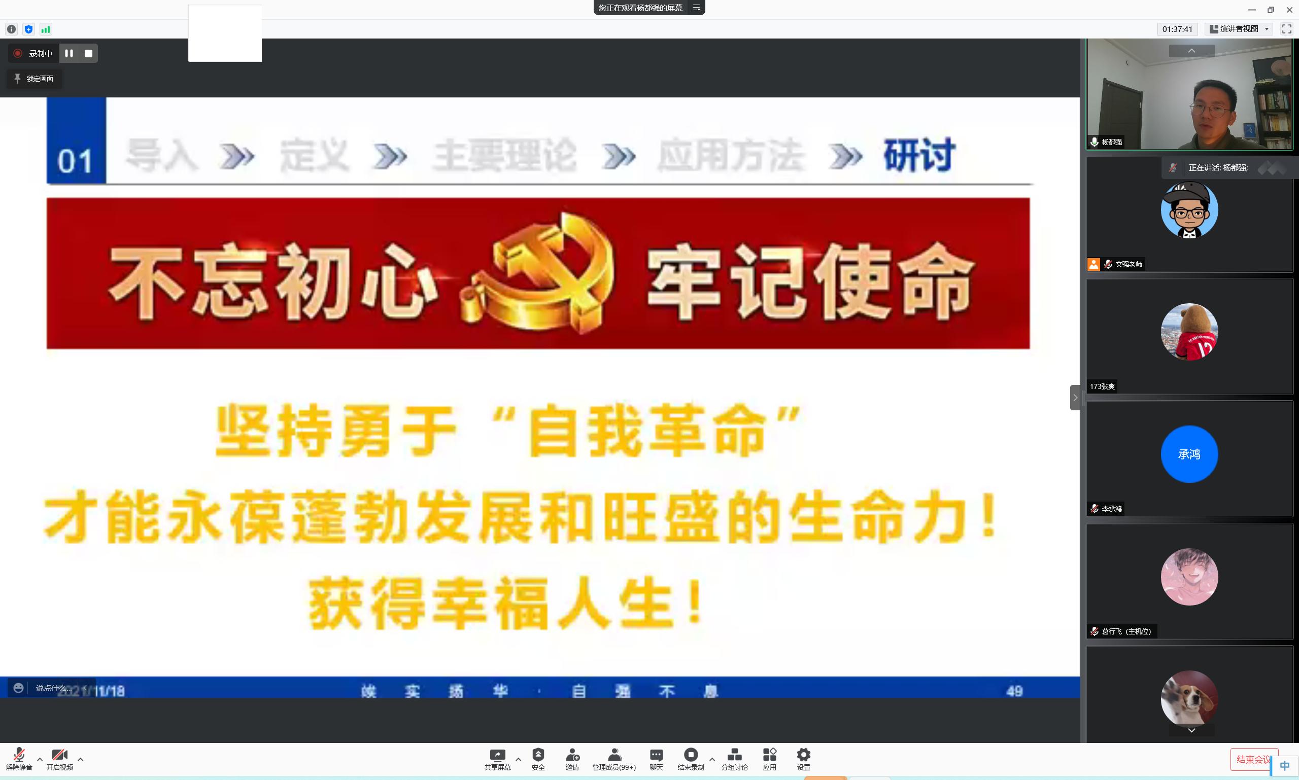 目前正值“两个一百年”奋斗目标历史交汇关键节点,同时又恰逢党的十九届六中全会顺利召开,讲座结束前,杨老师号召全体研究生要“不忘初心,牢记使命”,勉励大家要坚持并勇于“自我革命”,永葆青年的朝气,不断增强新时代青年的志气、骨气、底气。