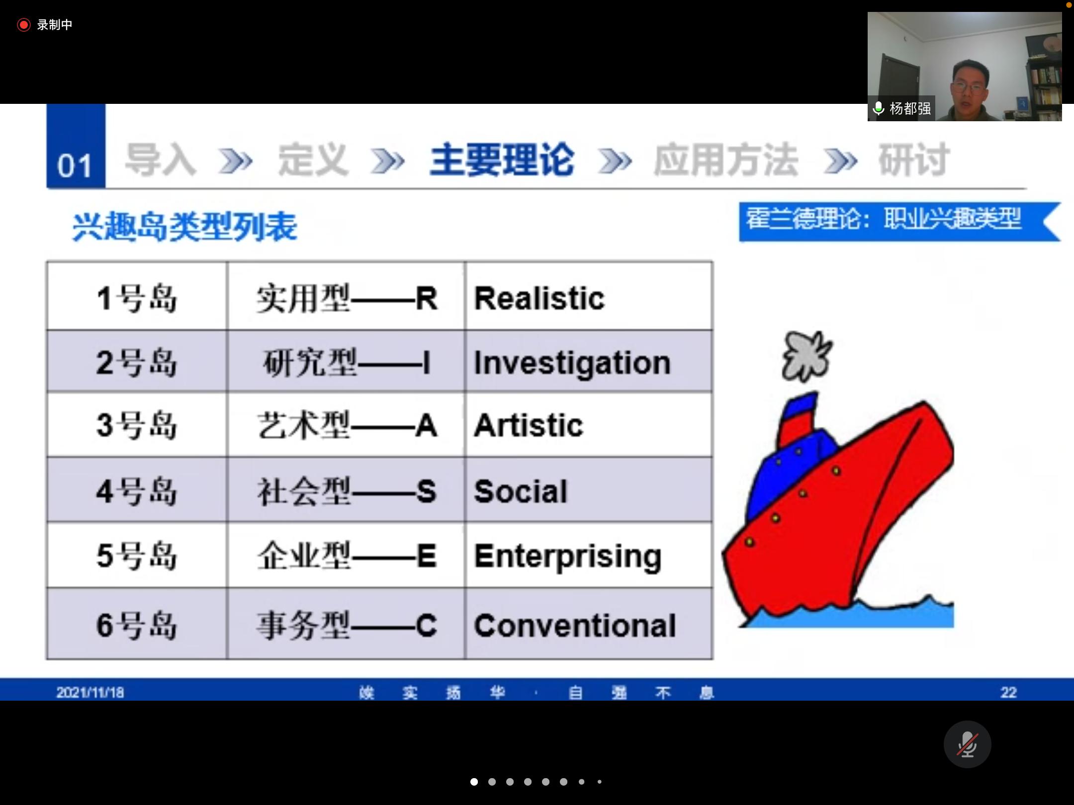 讲座伊始,杨老师首先给出了职业生涯的定义,以及生涯发展理论的六个阶段,即匹配、平衡、适应、选择、学习、行动,并讲解了帕森斯特质因素论、霍兰德理论、舒伯生涯发展阶段理论、明尼苏达工作适应论、CIP理论五个生涯理论。期间,大家也踊跃参与杨老师提出的一个兴趣岛自测游戏,积极通过讨论区与杨老师进行互动。