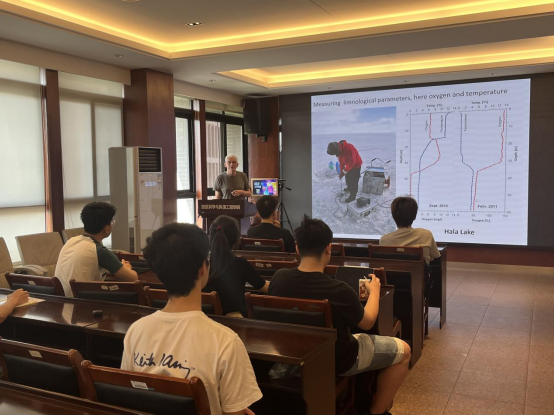7月7日上午,Bernd Wünnemann教授就“The perspective of sediment data for reconstructing processes and climate“这一主题,结合青藏高原的一些案例来证明湖泊集水过程、气候影响和新构造之间的关系,介绍了现场和实验室方法以及分析的沉积物数据(颗粒大小、矿物、地球化学、化石遗迹),并解释如何利用沉积物成分的变化来确定与水文气候和非气候影响有关的较长时期(过去12000年)的环境过程。Wünnemann教授表示,我们研究这些,重要的是要去体会大自然到底想告诉我们什么,只有更好地理解自然,我们才能做出更好的决策。学生们普遍认为这是一堂非常严谨且前沿的讲座,学习到了很多科学研究的方法。