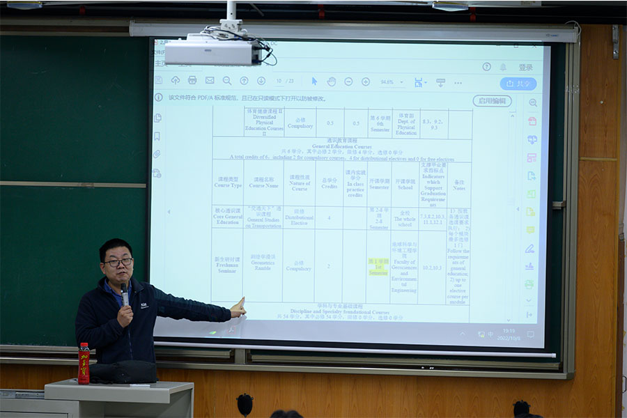 活动伊始,曹云刚向同学们介绍了本次活动的主要内容。接着,张同刚就学习目标、选课方式及注意事项等方面对测绘专业的培养方案进行介绍。他引导同学们正确选择课程,表示学校支持学生依据个人兴趣选择部分课程,同时列举具体反面案例,避免学生由于错误选课造成学业上的损失。最后,张同刚还就测绘工程茅以升班在培养方案上的不同以及茅以升班相关政策和选拔机制予以说明,帮助同学们深入了解专业培养情况。