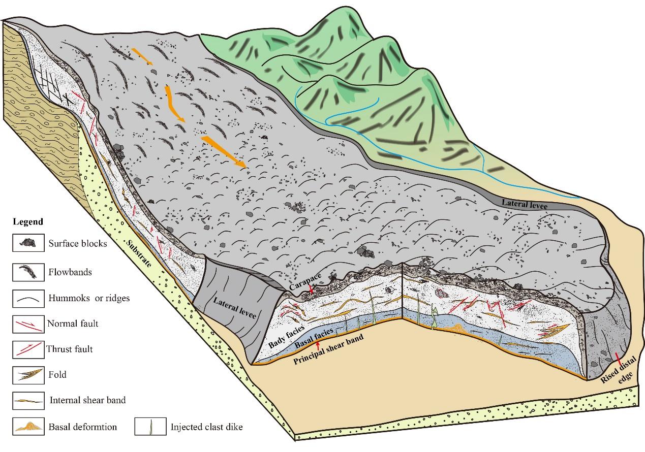 (3)国内外首次在高速远程滑坡侧缘堤中发现了由内向外翻卷的火焰状结构(图3)。这表明,在滑坡运动过程中,后部的滑体物质不断推挤并犁铲前部减速的滑体,导致前部滑体向外翻卷并形成火焰状的剪切带。这一发现揭示了高速远程滑坡侧缘堤的形成机制与滑体物质的侧向推挤运动有关,而非一些国际流体力学研究文献所报道的颗粒分选机制。