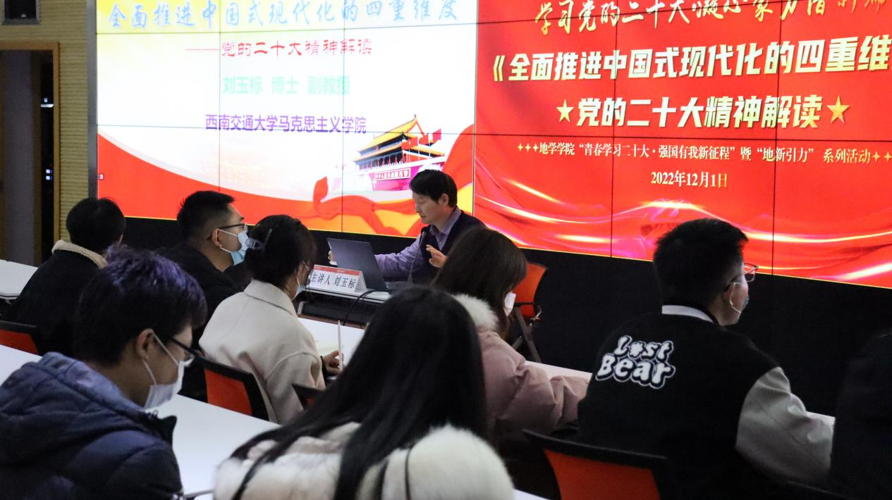首先,刘玉标以“党的二十大主题”为引,与在座同学进行互动,通过对二十大主题“伟大旗帜”、“思想路线”、“伟大精神”、“伟大目标”等内容进行逐字解读、逐句分析引出本次讲座的主题——“四重维度”,即举什么旗;走什么路;葆有什么样的精神状态以及朝着什么样的目标前进。