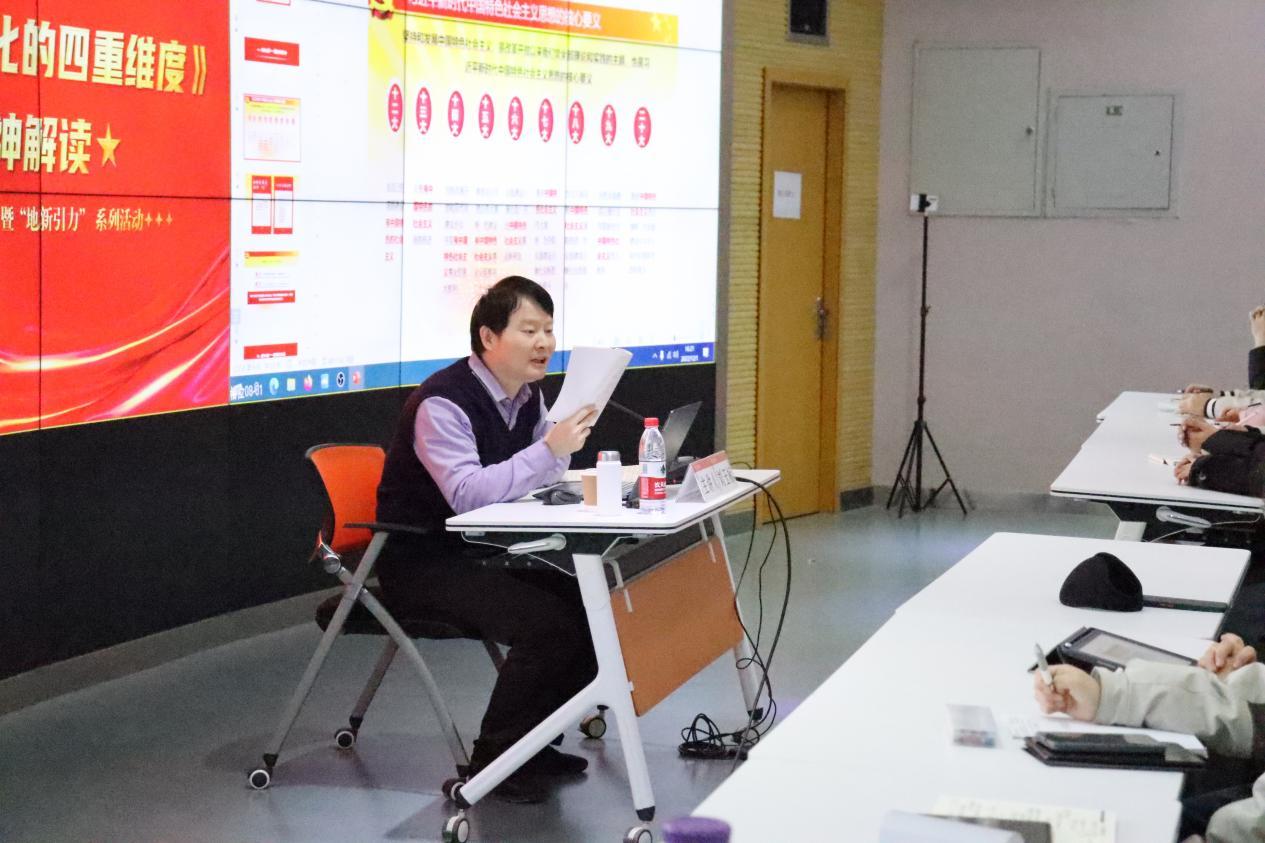 其次,刘玉标分别详细讲解了四个维度。其中,在关于旗帜引领方向部分,刘玉标结合时事,通过防疫政策展开了对中西方文化差异的理性讨论,从而强调要将习近平新时代中国特色社会主义思想的核心要义作为旗帜,必须走中国特色社会主义的道路,坚持两个“行”,六个“必须坚持”;深刻领悟“两个确立”的决定性意义。在对中国式现代化五大特征的稳定平衡现状分析后,刘玉标着重讲述了中国特色社会主义的正确性以及中国式现代化的优越性。