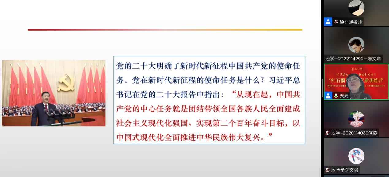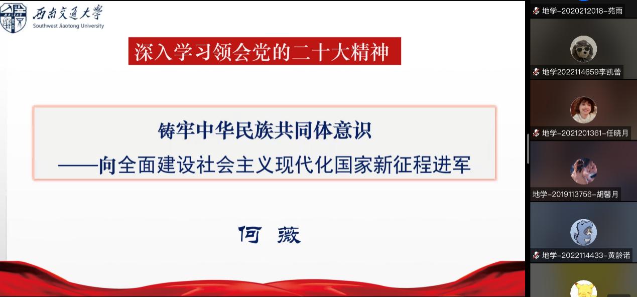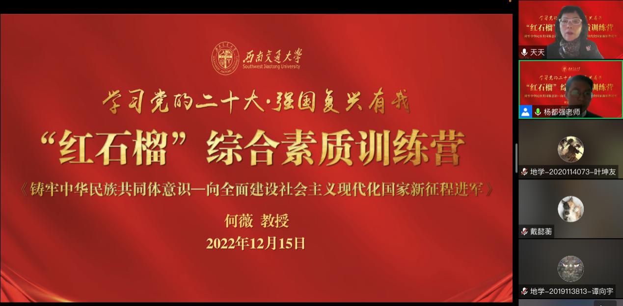 为深入贯彻落实中央民族工作会议精神和习近平总书记在中国人民大学考察时的重要讲话精神,学校以“喜迎党的二十大·强国复兴有我”为主题举办2022年“红石榴”综合素质训练营,以“喜迎和学习党的二十大”为中心,“铸牢中华民族共同体意识”为主线,促进学校各民族学生交流融合与成长成才。12月15日下午16:00,思政专家何薇教授在线上为本期训练营作主题为“铸牢中华民族共同体意识——向全面建设社会主义现代化国家新征程进军”的结营专题讲座,讲座由18H