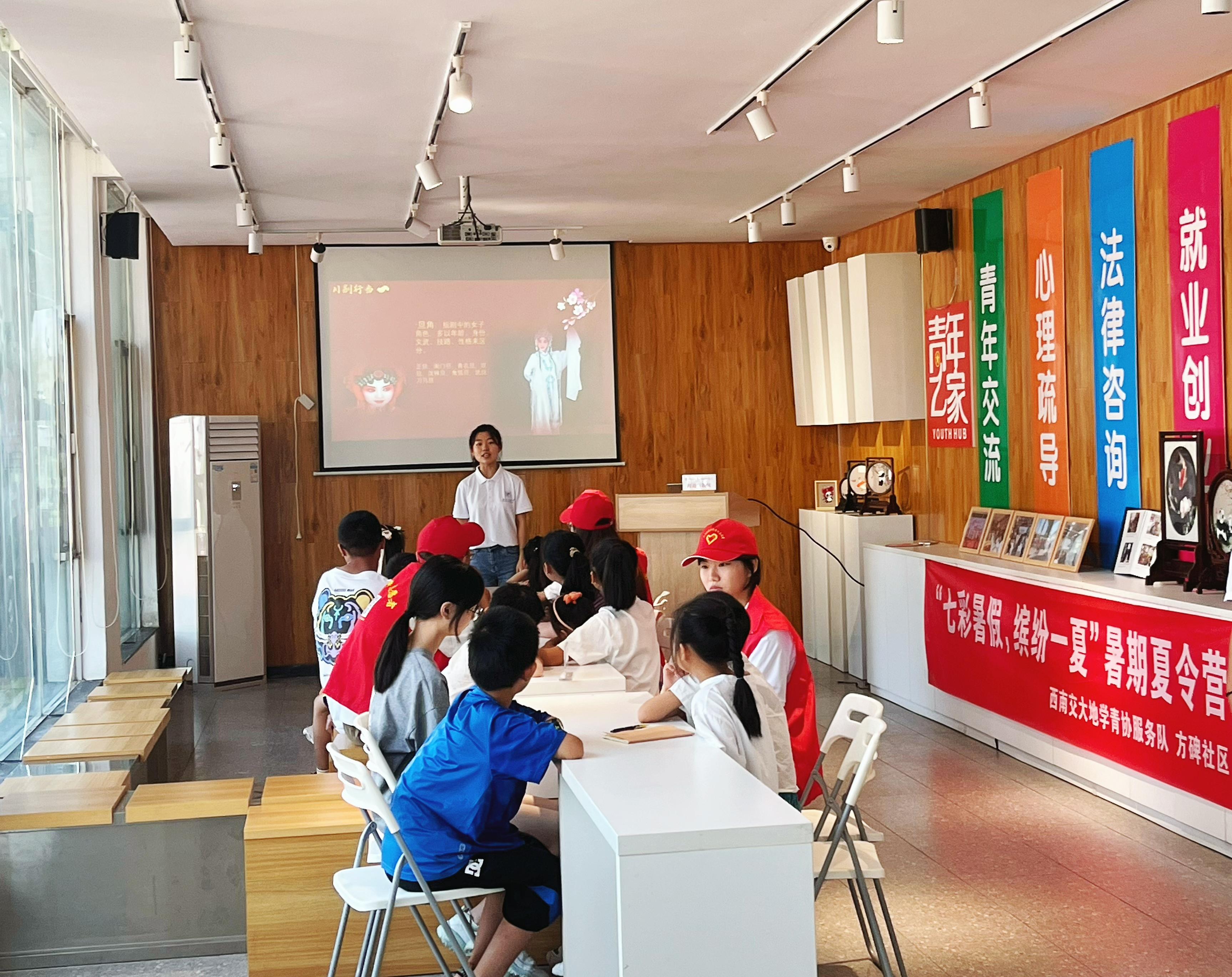 青协“七彩假期”实践队爱心课堂授课现场。张朝晖充分肯定了学校、学院组织青年学子就近就便深入社区一线,积极助力社会治理创新和社会和谐所做出的成绩,并强调,高校要加强校地常态化合作,充分利用“七彩假期”等专项实践平台,精心设计实践内容,确保志愿服务取得实效;要着力组织青年学生开展下沉式、进驻式的实践锻炼和学习体验。张朝晖要求,将学生在社会实践后的成果以一定形式体现出来,传承下去,让一届又一届的学生深入了解、熟练掌握、深受教育、增长才干,引导青年在亲身实践中深刻感悟习近平总书记对青年一代的寄望,对青年成长的教导。