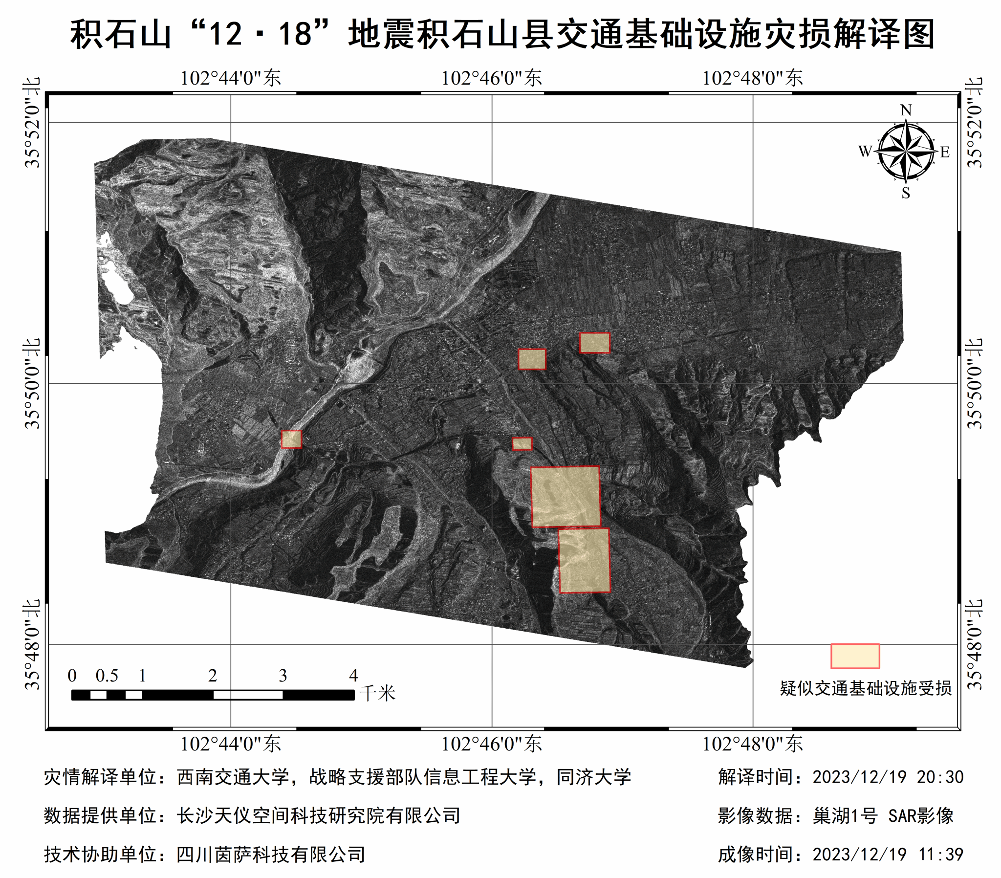 微波遥感科研团队的刘国祥、张瑞等联合战略支援部队信息工程大学、同济大学等兄弟院校科研团队协同开展震区交通基础设施灾毁解译分析,利用长沙天仪空间科技研究院有限公司提供的国产商业卫星“巢湖一号”合成孔径雷达卫星于2023年12月19日11:39获取的积石山县大河家镇震后影像,结合震前光学遥感影像第一时间开展对比解译,于19日21:00获得大河家镇公路、桥梁等交通基础设施的灾毁解译结果(详见附图与附表)。经初步分析,地震造成多处山体滑坡和边坡垮塌,掩埋断道十余处,局部造成多处桥梁路面过水,疑似桥梁垮塌一处。相关解译图件现已报送有关部门。
