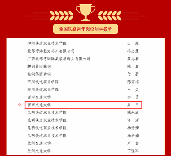 5月4日,为选树典型,激励奋进,引领青年积极投身铁路安全生产,立足岗位建功立业,进一步促进青年成长成才。全国铁道团委发布颁授我院周平老师为“全国铁路青年岗位能手”。