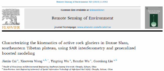 刘国祥教授团队在遥感领域国际顶级期刊Remote Sensing of Environment发表题为“Characterizing the kinematics of active rock glaciers in Daxue Shan, southeastern Tibetan plateau, using SAR interferometry and generalized boosted modeling”的学术论文。课题组2022级博士研究生蔡佳欣为第一作者,王晓文副教授为通讯作者。