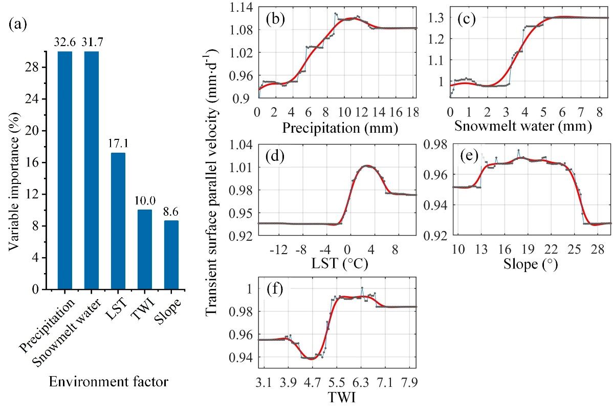 图3 (a) 不同环境因子控制石冰川运动的相对重要程度。(b)–(f) 石冰川运动速率对不同环境因子变化的响应曲线。