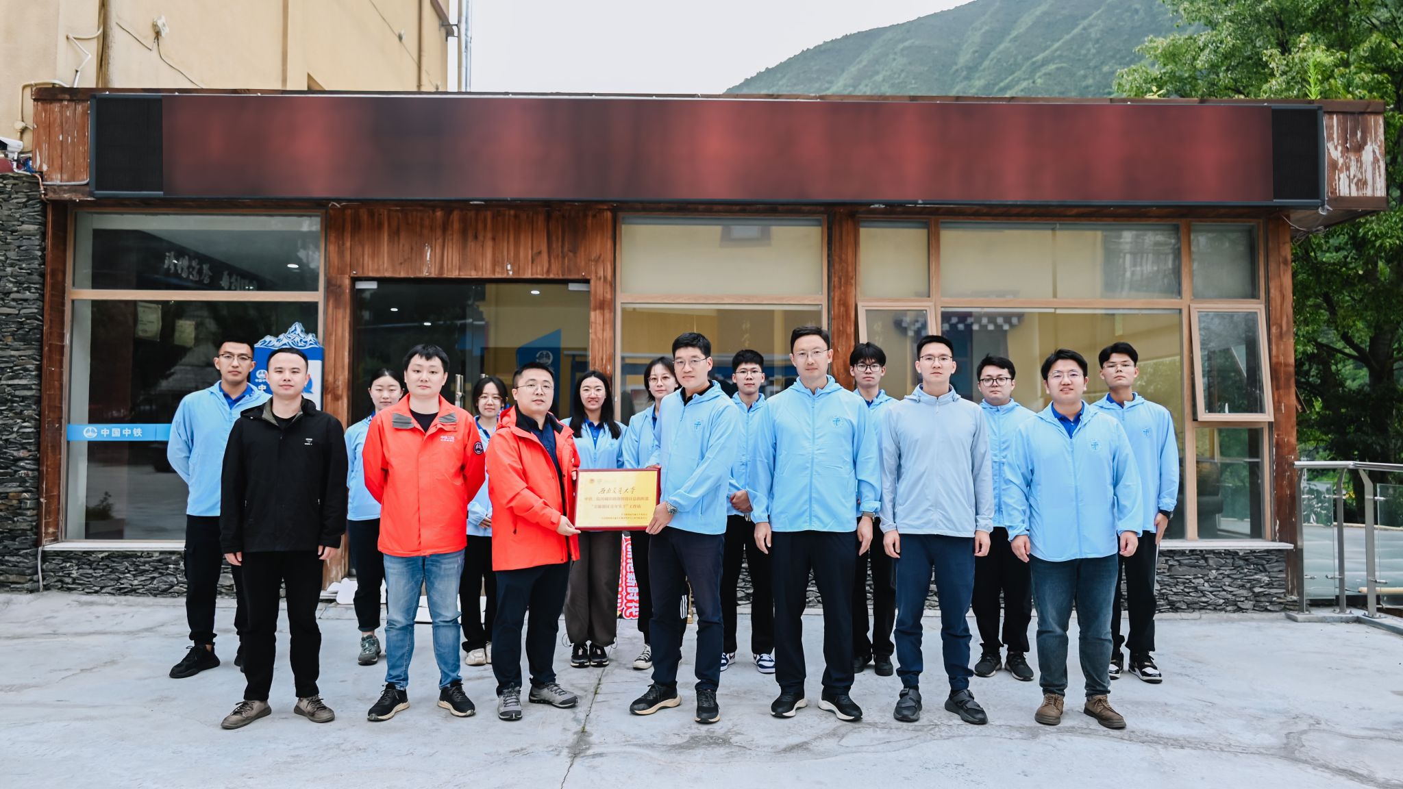 行走在世界屋脊,穿梭于崇山峻岭,跨越了怒涛激流的川藏铁路建设现场,是筑梦交通强国、激发爱国热情、开展大思政课最生动、最有说服力的教科书。施工现场张贴的一则则誓言,一幅幅标语……“我要把我最好的年华献给川藏铁路”、“让党旗在雪域高原高高飘扬”、“迎难而上,敢为人先”,都在上演一堂堂鲜活的思政课,激励着博士服务团的每一个成员。因此在某设计院川藏铁路建设总指挥部一线专家、博士服务团师生的共同见证下,双方领导共同为党员教育示范基地暨“大思政课”实践教育基地和“交通强国·青年实干”工作站挂牌,进一步为后续校企合作、人才培养、科研攻关等奠定基础,构建实践育人新范式。